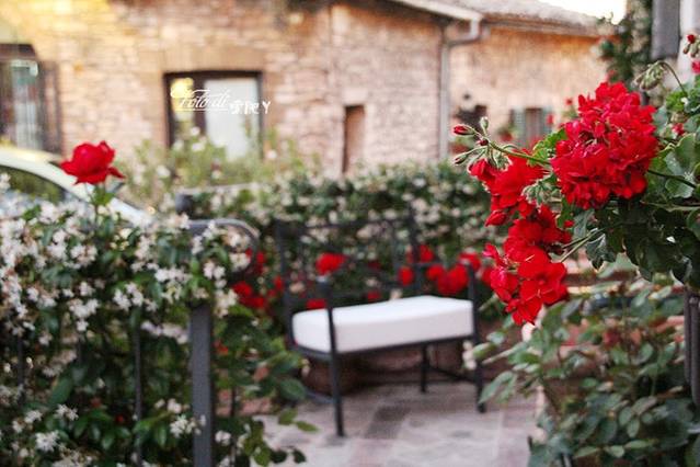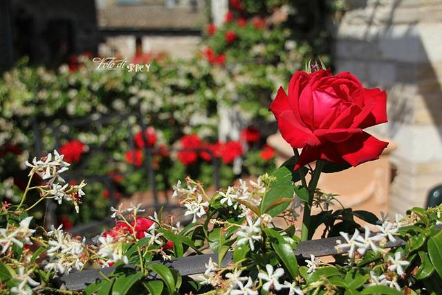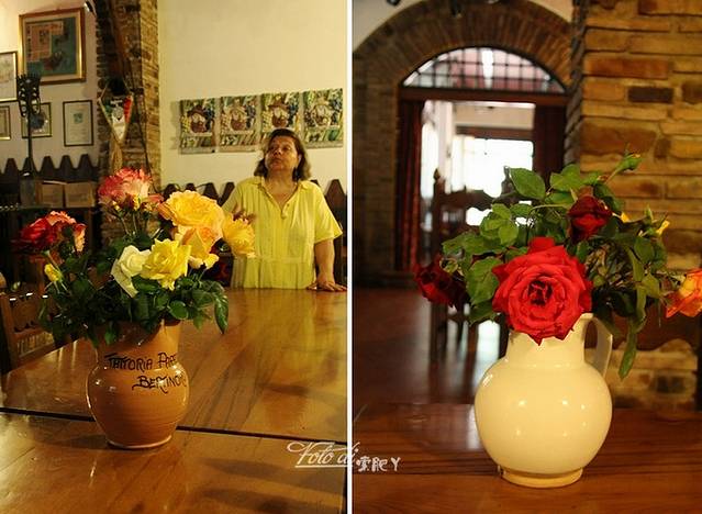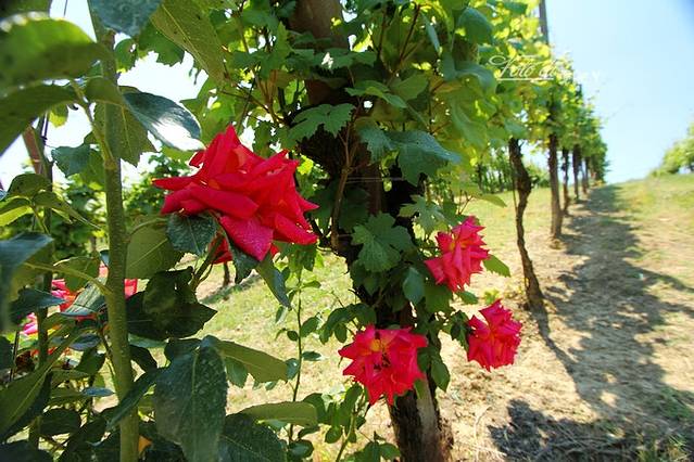 酒庄的餐厅里也处处装饰着玫瑰, 现在的酒庄女主人、马里奥.佩兹的女儿戛布里艾拉.佩兹(GABRIELLA PEZZI)告诉我们, 这些玫瑰都是从葡萄园里剪来的。 传统上,在葡萄园里种植玫瑰,是一种简单有效的病虫害预警系统,因为玫瑰与葡萄会感染同样类型的病虫害,而且玫瑰比葡萄更敏感, 一旦玫瑰上出现了某种病害,就意味着葡萄也即将感染同类病害,人们就可以及时采取措施,避免灾害的发生;如果某一年的玫瑰长得特别茂盛,那一年的葡萄收成也会特别好。到了现代,人们有了更先进的科技手段来防止病虫害的发生,玫瑰的预警功能渐渐被人们遗忘,但马里奥.佩兹先生相信,如果在葡萄园里种植玫瑰,通过花粉的传播,葡萄中会含有玫瑰的芬芳,所以从上世纪五十年代起,他又开始在葡萄园里种植玫瑰。而博洛尼亚大学实验室的分析结果表明,佩兹先生的想法是对的,天堂酒庄的葡萄酒里果然有玫瑰的味道!!