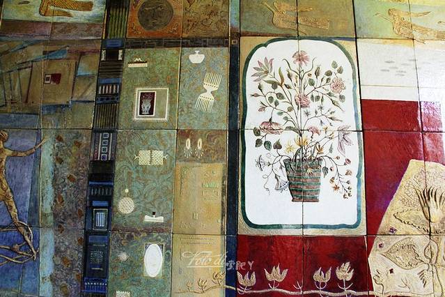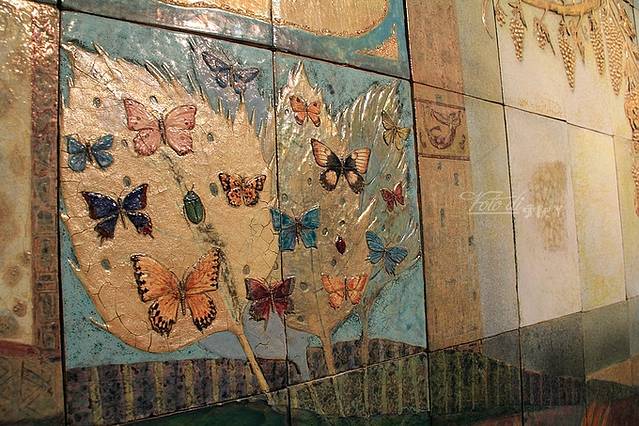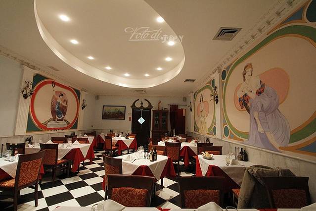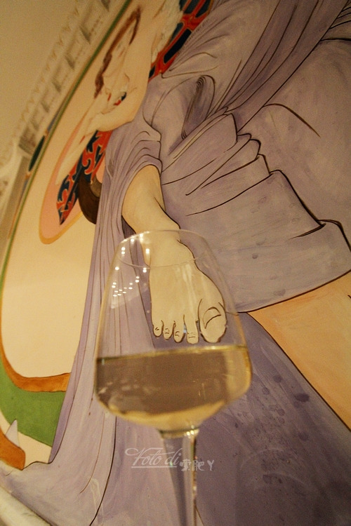 餐厅里有两个厅, 一个是木板地面的,周日表演探戈时才开,平时营业的是这个厅。 装修颇花了点心思,古典中有现代, 墙上的壁画有些波西米亚的新艺术运动创始人慕夏的调调,清新妩媚中透着点颓废。