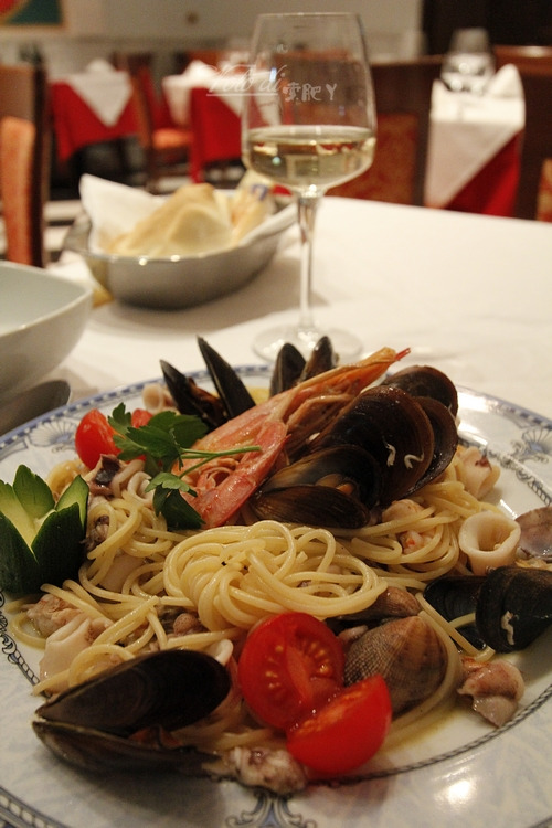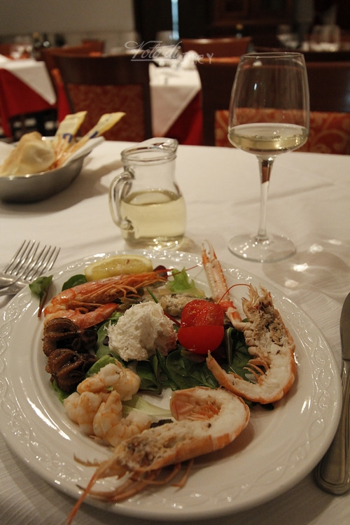找了个靠墙的位置坐下,经理拿上来菜单,翻了一下,不贵。 点了一份海鲜前餐,12.5欧元,又要一份海鲜面,还是12.5欧元,再叫了四分之一立升白葡萄酒。餐厅里此时没有别的食客,因为之前经理说,可以随便拍照,于是我便离开座位拍,刚拍了两张,他就端着我的前餐上来了。 这么快!