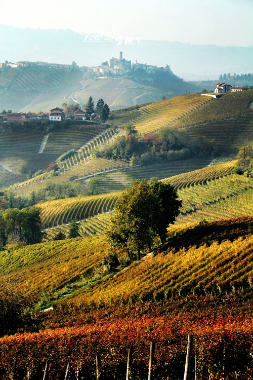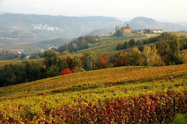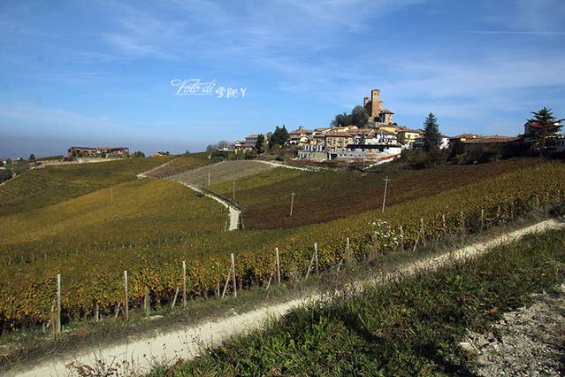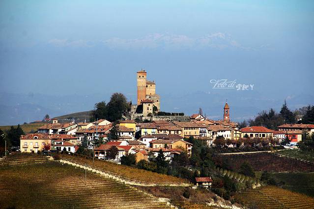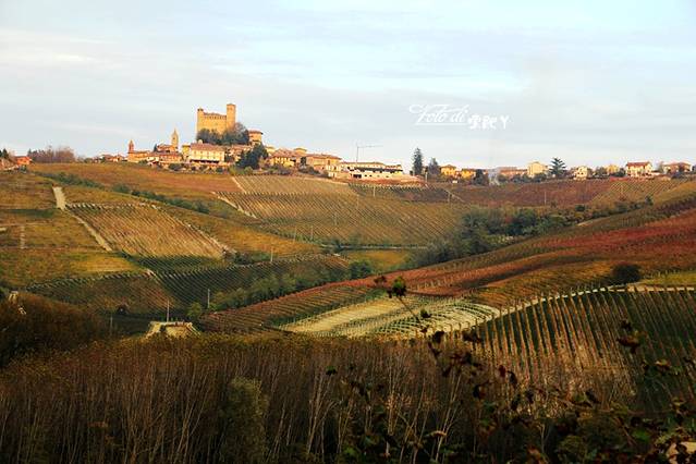 Langhe地区的经典宣传照片是连绵的雪山下无边的葡萄园。我去的时候山谷里有雾,雪山看不清楚,但眼前的风景依然很迷人。大地起伏如波涛,那些连绵的曲线只在一座座小山顶上被打断----许多小山顶上都坐落着一个古老的小村子,而每个村里都有座城堡,那些城堡高高的塔楼,象一个个重音符号,让Langhe的天际线变得活泼而富有节奏。