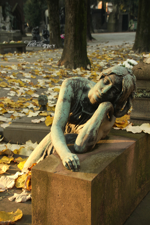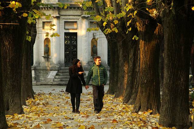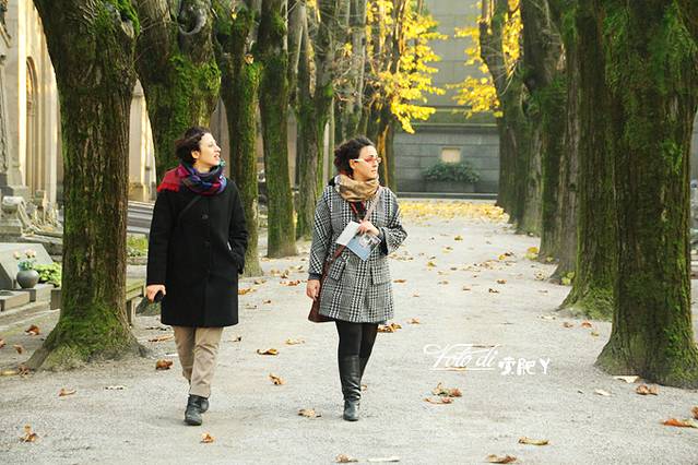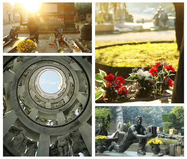 我去的时候是深秋的黄昏,公墓内外仍然有一队一队的旅行团。我去的时候意大利人扫墓的日子11月1日早已经过了,因而看不到扫墓的人的身影,满园子都是举着相机的游客。