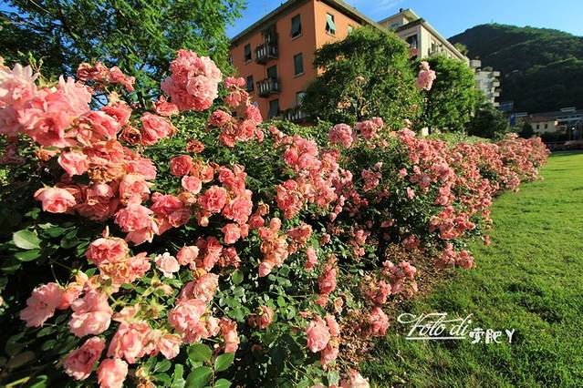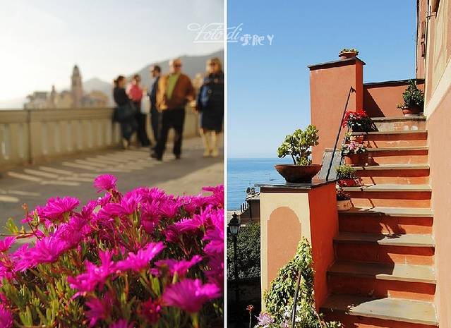 这堵画着非常逼真的栏杆的矮墙,其实是CAMOGLI小镇的垃圾场的围栏, 墙内放着七八个巨大的垃圾箱,外面一边是这样的墙,另一边是一组放大的本地风景的黑白老照片,矮墙上还放了一大排各色仙客来。随性的意大利人,要么不捯饬,随便自家外墙满是岁月风雨痕迹,可捯饬起来,比谁都能捯饬。