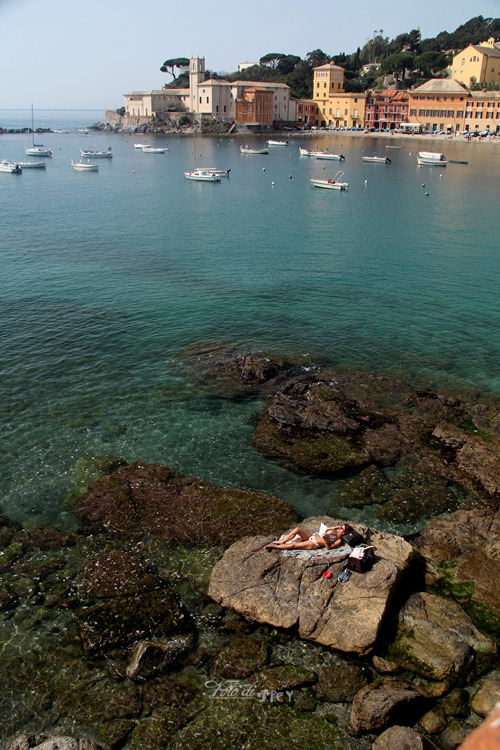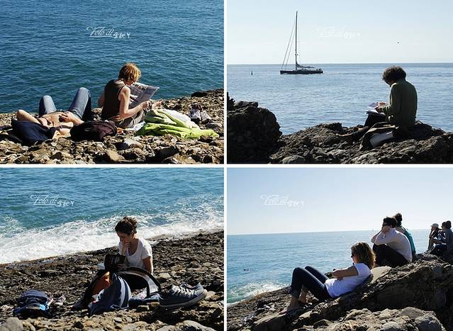 从半山的S. ROCCO走到这个岬角大概一个小时的路程吧,这老老少少前赴后继地走到了之后干啥呢? 还是一样,晒!太!阳!!! 走半天也就是换个地方晒太阳,对着大海发呆,或者看书看报纸甚至有位夫人坐在岬角的最最顶端一块石头上写东西----我看了,不是填字游戏,大笔记本上写得密密麻麻的不知道是啥。不同民族享受生活的方式真是不一样, 我一直觉得欧洲人比国人有更多的冒险的野性冲动,却又有比国人更为安静的内心。