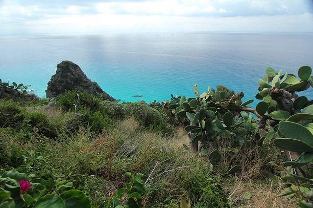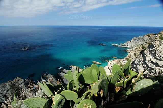 终于走到那个岬角了,其实风景挺普通,就是一条几十米长的岩石堆伸到大海里,岩石上有一个废墟, 岩石周围的海滩上长着茂密的仙人掌,颇有野性的气息。
