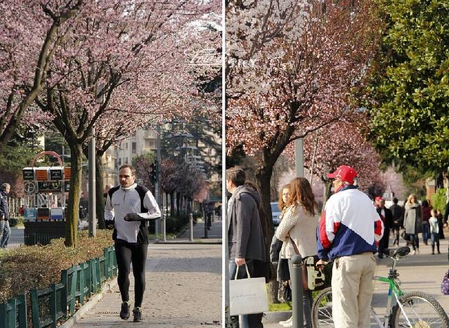 我比较熟悉的,就是这满街的红叶李,满城到处都是。这花原本可以开得更嚣张一点,真正做到铺天盖地的,但是因为影响到主干道上公共汽车的行驶,每年冬天都被修理树冠,所以春天开出来比应有的规模要小了不少。