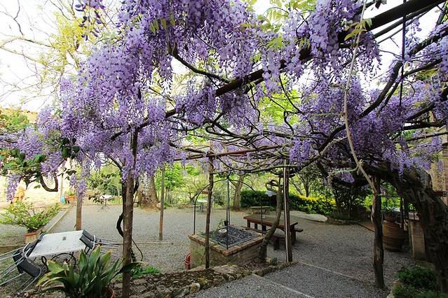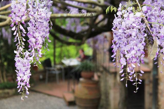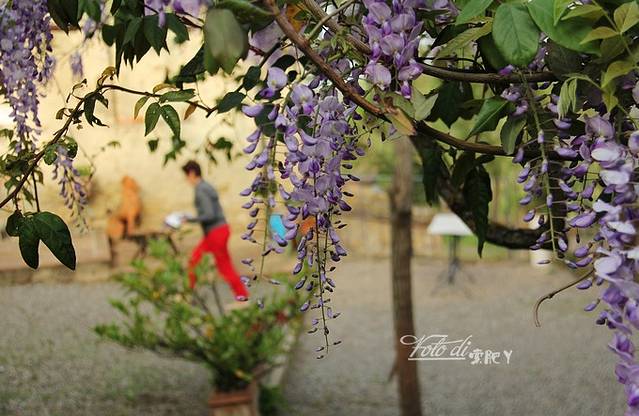 那真是很大很大的一株紫藤,连卢洽娜也说不清它应该有一百多少岁了。它遒劲的藤条如八爪鱼的触须般四面八方蔓延,几乎布满了前院平台的每一个角落,将那些台阶、古井、座椅等都庇护在它密密匝匝的紫色花串下。它真的是太大了,而且延伸的形状不规则,以至于我换了N个角度用我的10-22的超广角都不能把它拍全了!