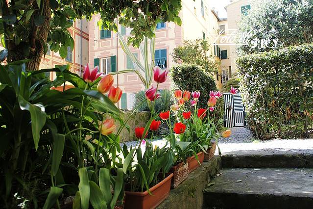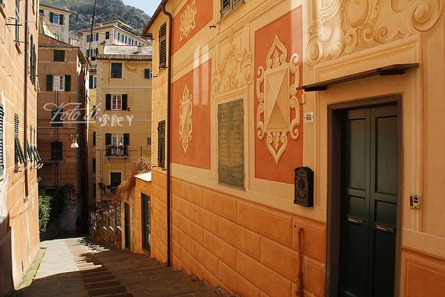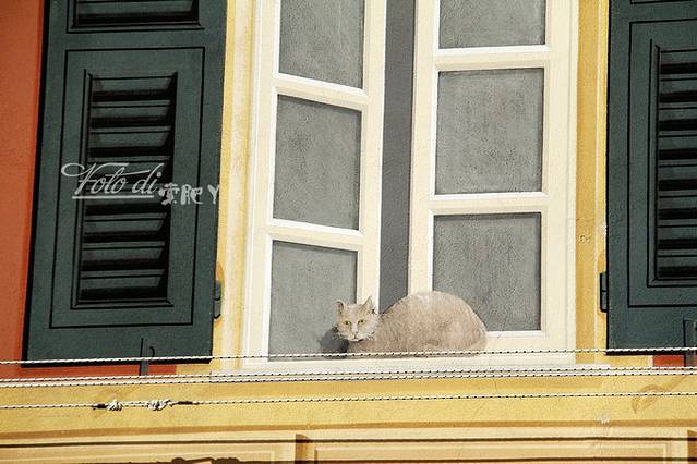 利古里亚海边建筑的一个特点,是在外墙上画上以假乱真的建筑结构做装饰。 上图右边的房子不仅下方那些“大石块”是画的,墙上那些浮雕一样的花纹是画的,连中间那扇绿色的窗户也是画出来的。