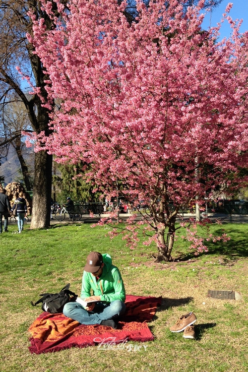 然后就轮到了各种红的白的粉的蔷薇科木本花乱开的时节。别问我这都是啥啊,我也搞不清。看到上面这张有个帅哥看书的照片我就生气,那是3月底的时候拍的,结果我5月底的时候穿得都比他这张照片上多,这都什么气候啊!