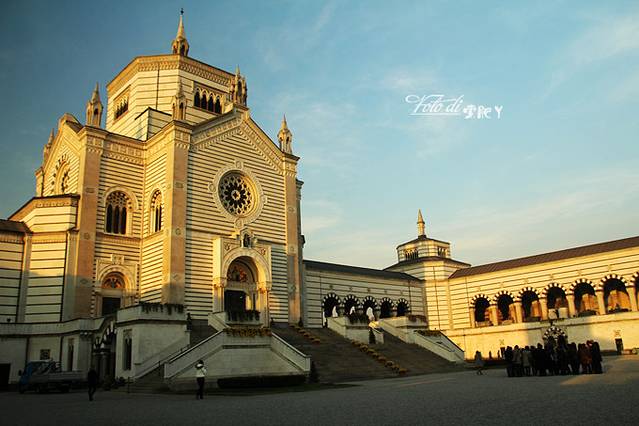 公墓正门是巨大的名人堂,由白色大理石建成,许多意大利名人都安葬在这里,例如意大利最伟大的作曲家威尔第。