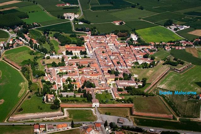 从空中看Sabbioneta是这样的(图片来源于网络,作者Danilo Malacarne),六角星一样的坚固的围墙包围着整齐笔直的街道, 教堂、宫殿、剧场、民居,一切都井井有条。 事实上,这是一座建立在波河的泥沙上的城市,意大利语沙子叫做sabbia, 城市的名字的来源正在于此。在沙地上兴建一座完美城市,需要足够的热情,更需要足够的科技水平。