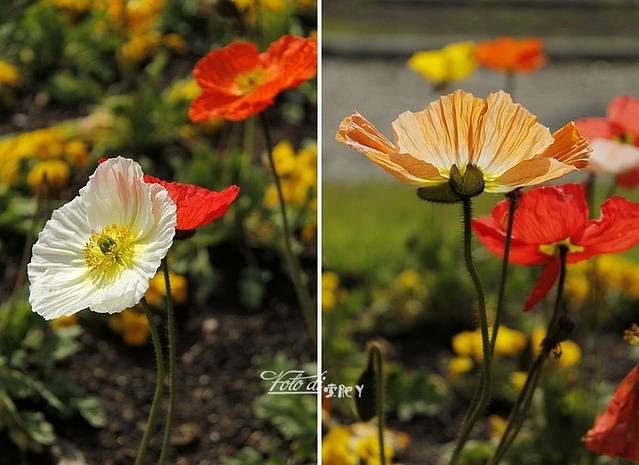 园子里有很多种颜色的虞美人, 白的黄的粉的红的橙的,薄而多褶皱的花瓣在风中显得特别的柔美。 我老觉得它们象我们小时候用一种皱纸做的花, 把皱纸在筷子上卷得紧紧的,两头一挤,打开来,就是一瓣又卷又皱的花瓣了......