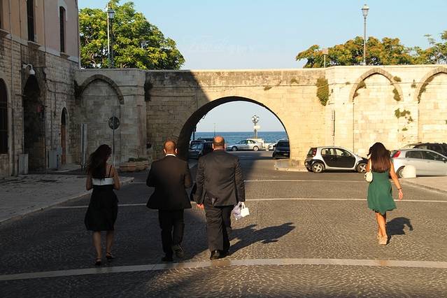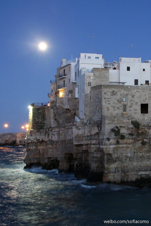 那夜收留了我的梦的海滨小城叫Polignano A Mare, 读作波利尼亚诺阿马莱, A Mare的意思是”在海边“,所以我们叫她”海边的波利尼亚诺“好了。小城在意大利南方的普里亚大区,意大利的领土形状象只高筒靴,波利尼亚诺就在”脚跟“和”鞋跟“衔接的地方。从米兰乘火来来至少转车一次,车程八小时左右,从罗马来也要转车一次,时间五小时上下。