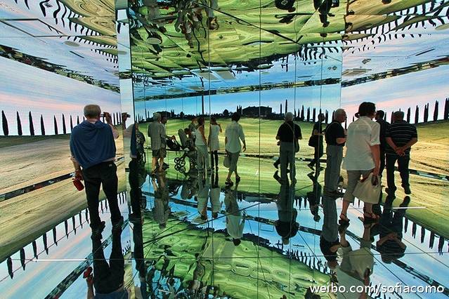 为了保证参观效果,意大利馆要控制人流量,固定时间内只能有有限数量的观众,结果我中了大彩, 排队中每过一“关”都正好放到我前面一个,我就被关在后一批里了。终于到入口了,工作人员对让大家排大队表示了歉意,并表示希望即将看到的一切值得大家如此等待。