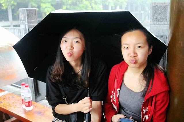 泛舟完毕,我们回客栈休整了一会出来吃饭。天有不测风雨,一到风桥就下大暴雨了= =只能坐在风桥躲雨。雨下了好长时间,桥上有很多卖雨衣的阿姨和扎小辫的奶奶,很是热闹。雨停了,继续像大使饭店前进,可是刚好走到虹桥口时候又下大雨了,于是当即决定去最近的KFC吃饭。KFC也很接地气,炸鸡真的真的...很咸
