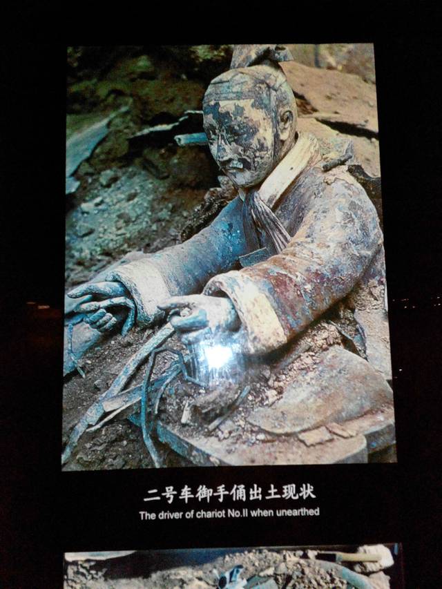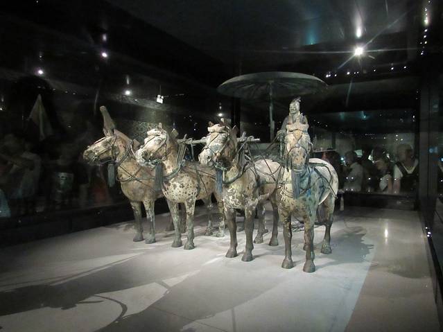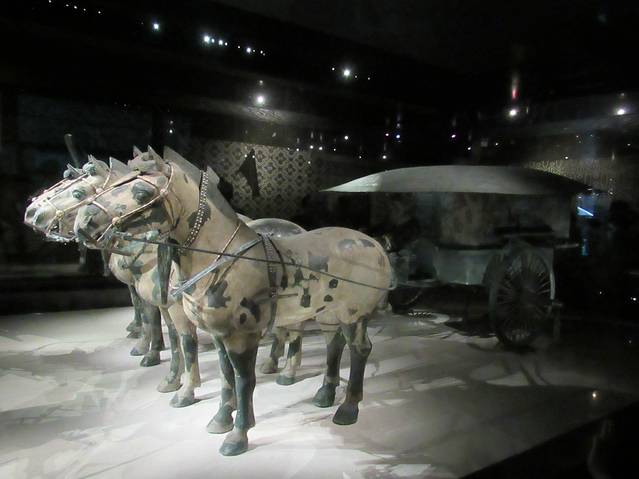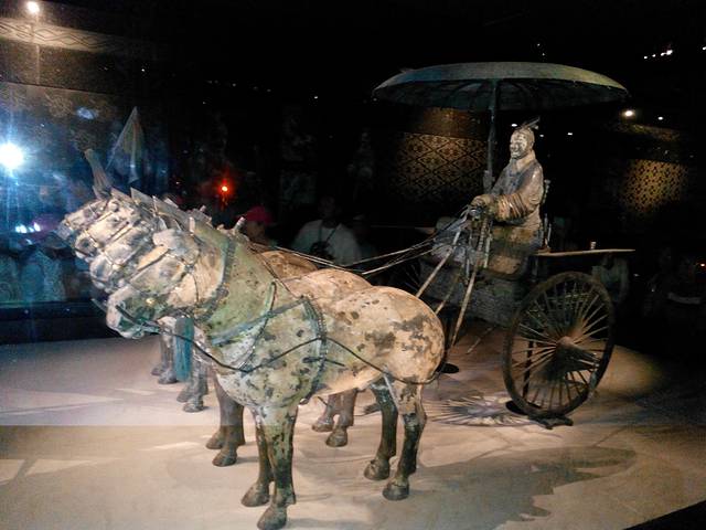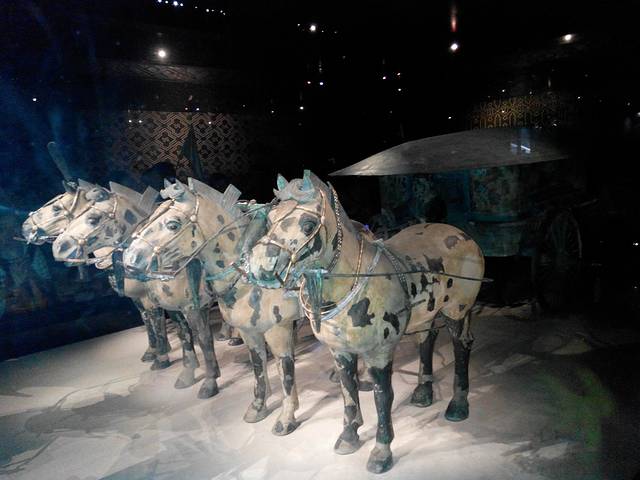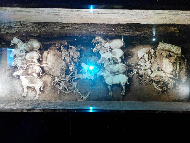 1980年12月在秦始皇陵西侧20米处发掘了两乘大型彩绘铜车。经修复后于1983年10月1日对外展出。两乘车都是四马单辕。由大小3400个零部件组装而成。其中二号车车长3.17米,高1.06米,铜马高65-67厘米,身长1.2米,总重量1234公斤。主体为青铜铸造,车马金银饰品1720件,金银器总重7公斤。制作工艺精细,造型逼真,是我国出土文物中时代最早,驾具最全,级别最高,制作最精的青铜器珍品,也是世界考古发现的最大青铜器。