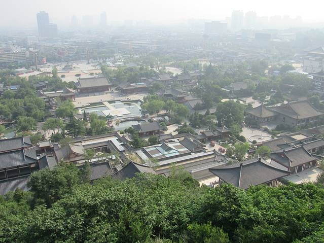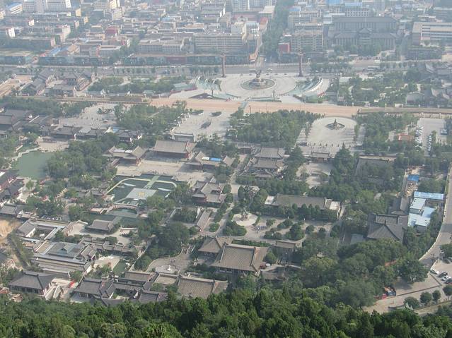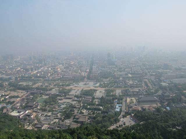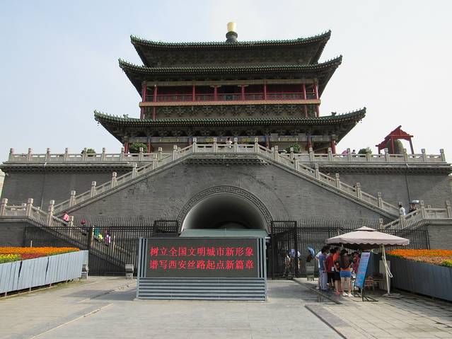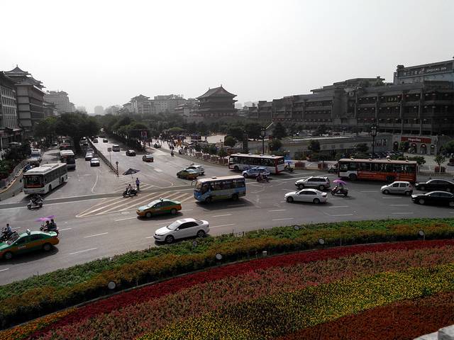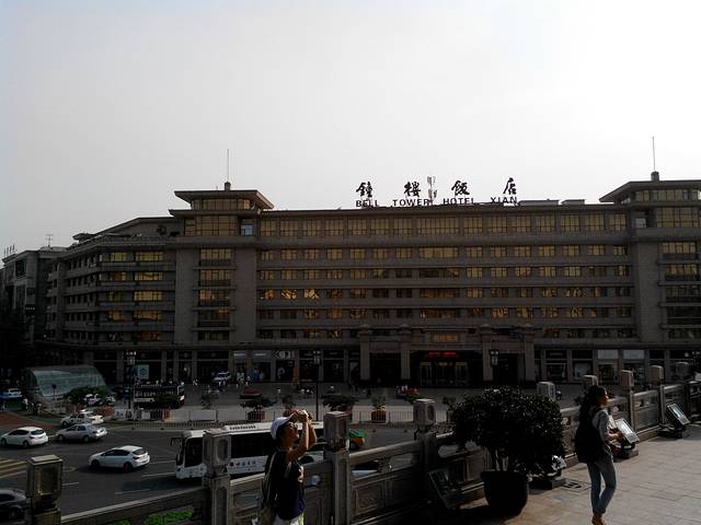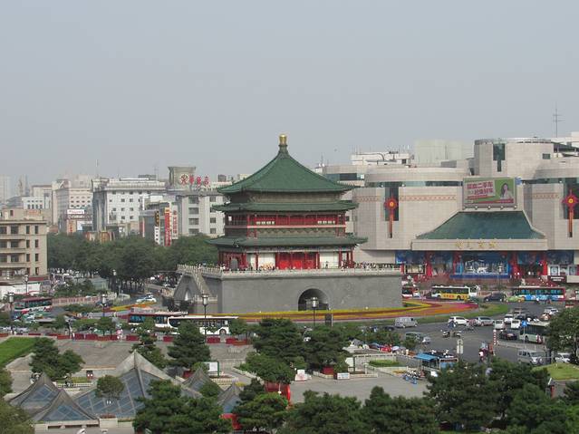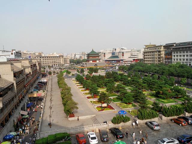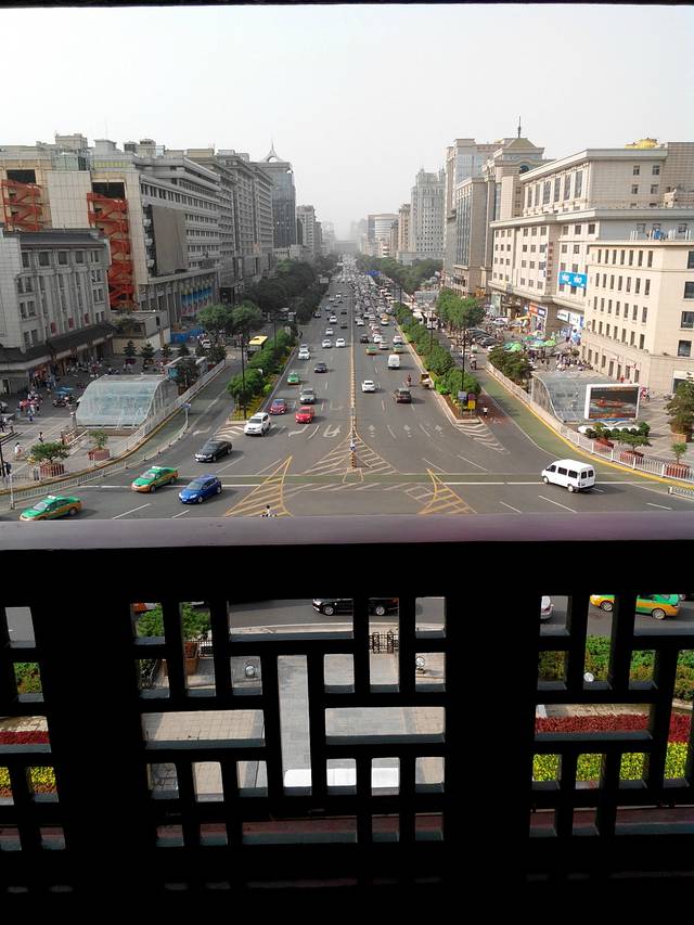 钟楼位于西安城的正中。站在钟楼上可以隐约看到东西南北四个城门。