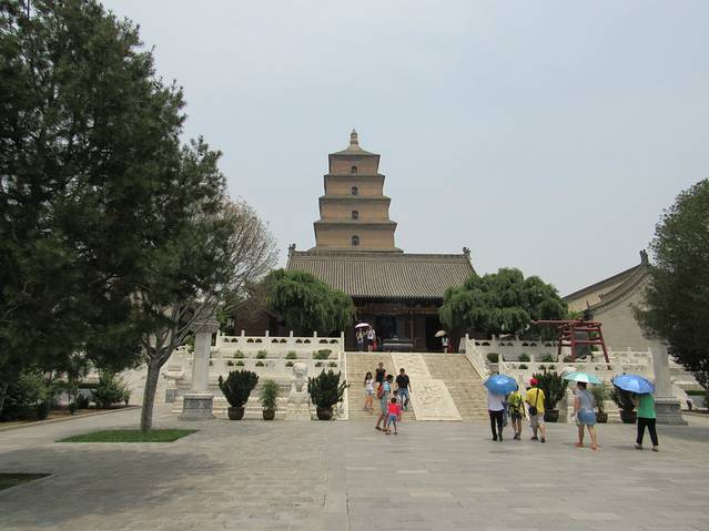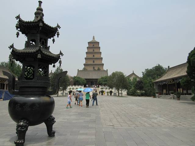 大雁塔位于陕西省西安市的大慈恩寺内。唐永徽三年(652年),玄奘为保存由天竺经丝绸之路带回长安的经卷佛像主持修建了大雁塔,最初五层,后加盖至九层,再后层数和高度又有数次变更,最后固定为今天所看到的七层塔身,通高64.5米。