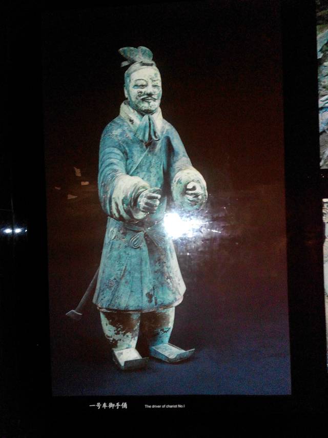此展品为秦代的陶器,通高91.00厘米,重70.60千克,出土于秦始皇帝陵西侧铜车马陪葬坑,为秦陵一号铜马车上的御官俑。御手头戴鹖冠,身穿长襦,背负青铜剑,双手恭谨地握着辔绳,双目注视前方,面部表情沉静,严肃中透出一丝轻松。从御者的冠饰和腰间佩剑、佩玉情况来看,他们不是一般的御手,而是高级御官。