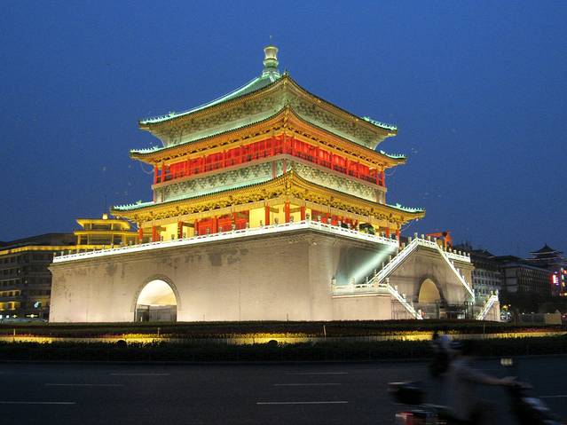西安钟楼位于西安市中心,明城墙内东西南北四条大街的交汇处。建于明太祖洪武十七年(1384年),初建于今广济街口,与鼓楼相对,明神宗万历十年(1582年)整体迁移于今址。