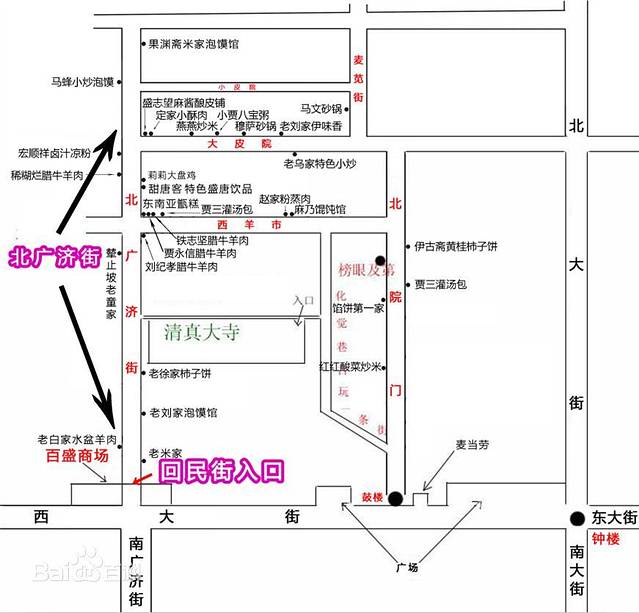西安回民街作为西安风情的代表之一,是回民街区多条街道的统称,由北广济街、北院门、西羊市、大皮院、化觉巷、洒金桥等数条街道组成,在钟鼓楼后。