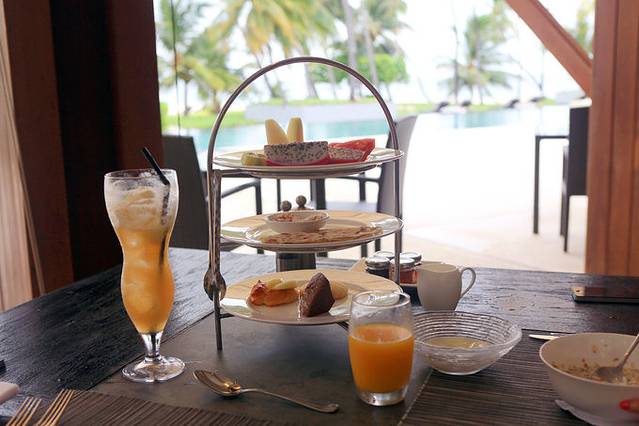 早上10点,我们从雨林小道走去餐厅早餐。林间偶尔几只硕大的蝙蝠朗朗飞过,就连岛上的蝙蝠也已完全剥离了阴郁外表。餐厅是一个非常通透的挑高木建筑,正对着美丽修长的泳池和辽阔印度洋。这是我们进行了一半的早餐,好喝的橙汁令女巫一连喝了好多天都不曾变心。菜单上有各种好吃的名字,据说集合了全球凯悦酒店连锁的美食。想吃什么,任点。