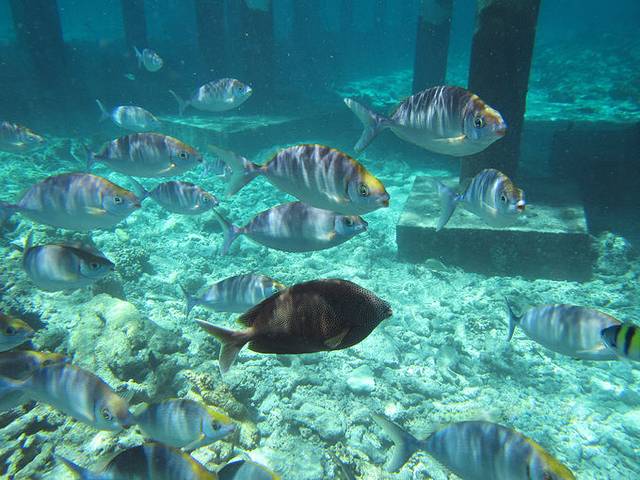 好吧,贴几张摄影大叔的水下处女作,代表我的看见。那些鱼身边的柱子就是我们51号水屋的地基噢。