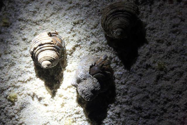 哈达哈岛环岛一周大概是20分钟。晚餐后,我们从沙滩慢慢绕回房间,结果边走边玩了1个小时。打开小电筒,夜晚沙滩是小螃蟹的天地。它们三五成群,横着从海里一闪而过跑到某个洞穴里,又或者百无聊赖的从沙滩左面走到右面,然后再走回来。我们还拍到几只正在开会的寄居蟹。它们看到光,就赶紧缩了头脚,天真的以为我们彼此都看不见了。