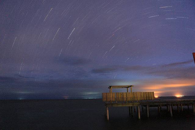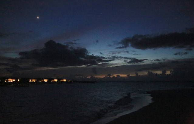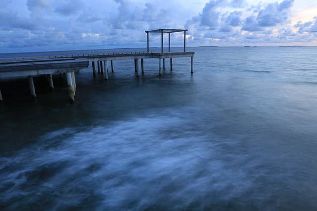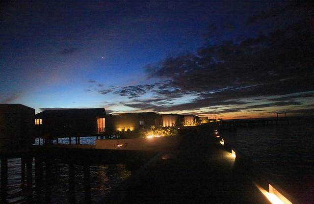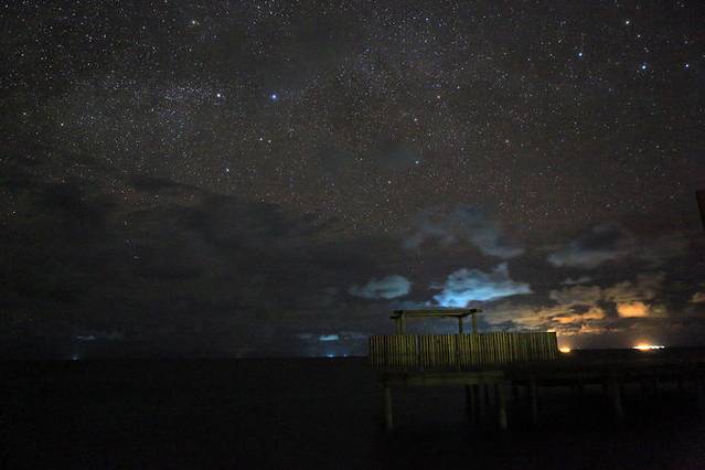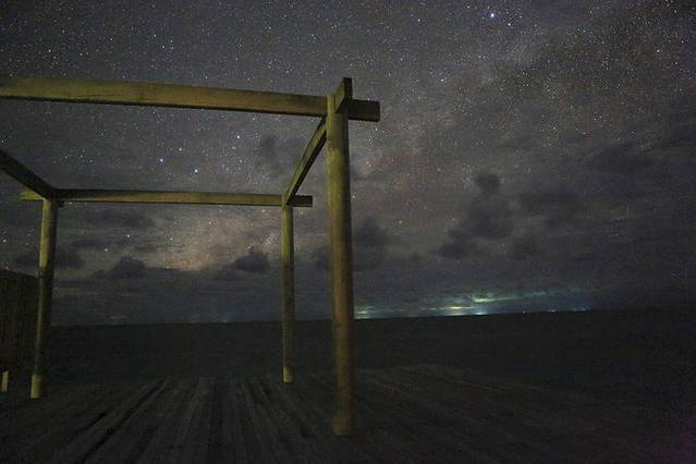 夜深了,听着海涛,谁都舍不得睡。抬头仰望,密密麻麻的星星,正悬挂在赤道上方瓦蓝色的深邃天空。摄影大叔用三脚架支起相机,先到对面的栈桥上,用高感 光度、5秒的速度定格了星空下的水屋,一颗流星正出期不意地突然滑过。掉转镜头,发现栈桥上方竟然有一条银河明晃晃地横亘空中。最后折回露台,架好相机, 对准天空,缩小光圈、降低感光度、打开B门,用快门线锁住快门,曝光两三个小时,记录下今晚星空的心路历程。