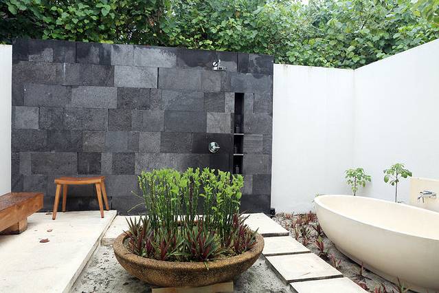露天院子,也是沙屋的其中一个浴室,花木扶疏,精致的浴缸和花洒。每次洗澡都可以看到一只壁虎在灰墙上忧伤的徘徊。是的,从未发现过两只同行。