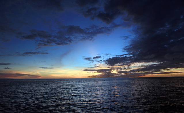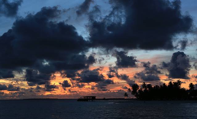 第四天,平生第一次在辽阔的海面上醒来,大海还将醒未醒,天色将明未明,深呼吸,空气里都是黎明的味道。看那东边的天空,浓浓的云正堆积、游走,天空一点点 火红着,将哈达哈岛沙滩上的椰子树也披上了金光。而这时西边天空依然青蓝色,只是在栈桥的衔接处,那些红慢慢被晕染过去。