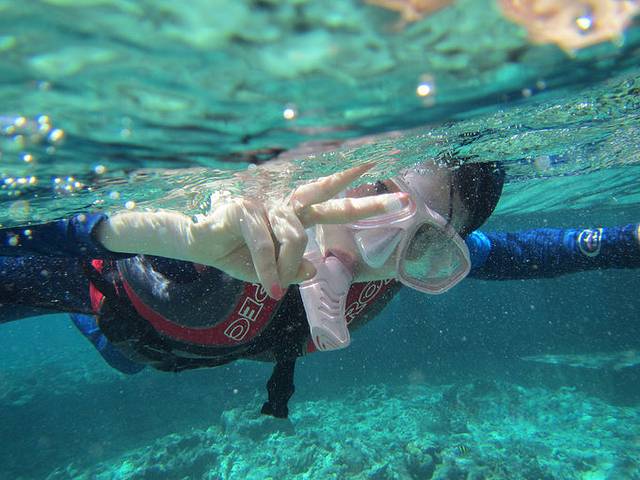 下午依旧是水屋下浮潜,女巫依旧在海浪中紧紧抓住铁杆子不敢松手。上岸才发现手掌红红的都快磨出茧子了。摄影大叔在嗤笑我之后,趾高气扬的出发去参加预约好的深海潜水项目。刚一出门又折回忧心忡忡拿上手机,深思远虑道:万一没有中文翻译,还能手机在线翻译挖。