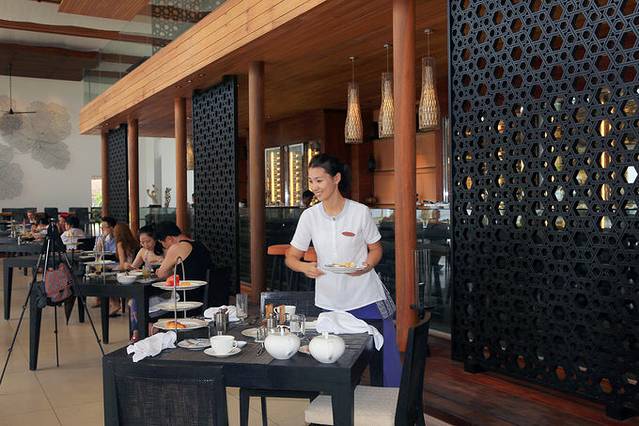 那位穿白色上衣站立着的小伙子就是我们的管家benny,每天当我们出现在餐厅时,他都会来轻声问候,他的声音很低,音调拖得很长:今-天-过-得-好-吗-。然后他说,明天上午10点帮我们安排好了spa。他说的实在是太慢了,慢得让女巫忍不住打断了他:好-的-啊-明-天-见-