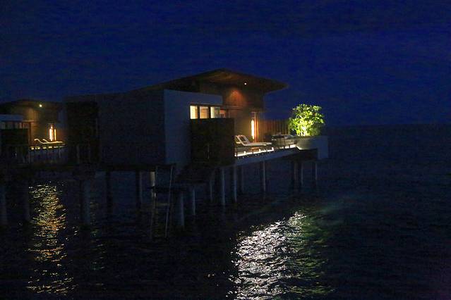 就算知道有更好的在等着,还是回头再次依依不舍的告别沙屋。坐上小黑的电瓶车,我们开往海上栈道。之前在攻略里看到,43号之后的水屋都是浮潜圣地,大s来这岛上过生日时住的是46号。所以女巫在心里暗暗祈祷,电瓶车啊,请你开得远一点,再远一点吧。我们在突然放晴的太阳下开到了40号。。43号。。46号。。48号。。电瓶车还是没有停下来的意思,它继续往天边开过去,开过去。。。一直开到栈桥的尽头!第51号!第51号!女巫超级幸运的得到一间HADAHAA岛最完美最原理岛屿的水屋。