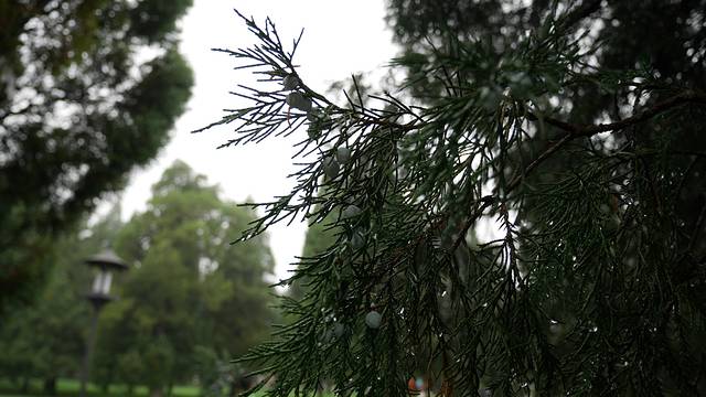 因为落过雨,大路两旁的松树上,挂满水珠。唔~~好多负离子~~