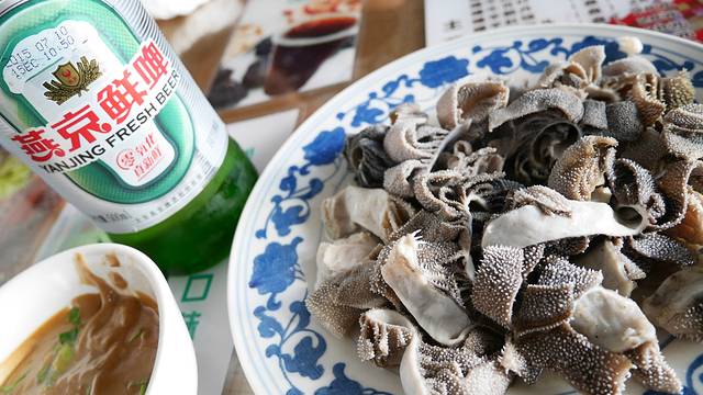来了份羊散丹+地道燕京鲜啤,绝配。散丹就是羊的胃,这口味特别的重。。。远远就闻到浓浓的骚味,点上花生酱。只容在口,不容在鼻~~