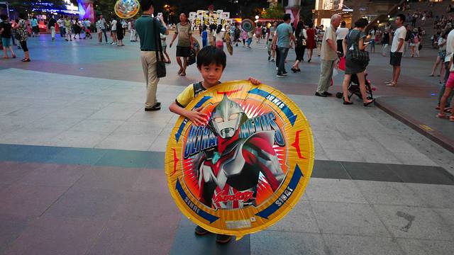 就是这个,叫UFO飞碟。这里的小朋友都在玩。朗少也向卖家哥哥拿来试玩了下。里面是充了少量氢气的,所以在空中时间比较长,像ufo的样子。问了下价格大的68小的48~~能折叠。。。