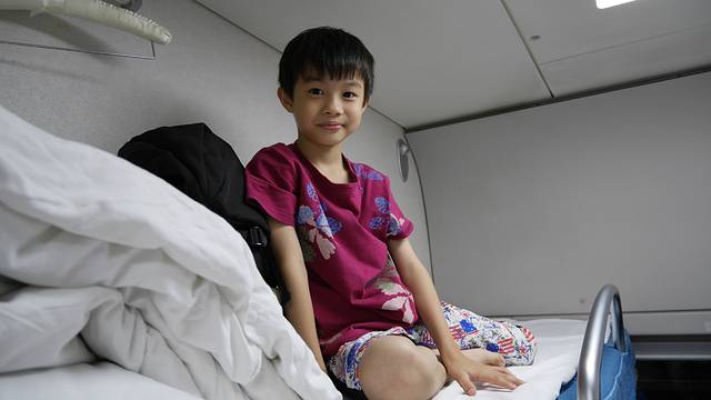 一间房有4张床。因为下铺有时需改作座位,所以有靠背,故此上铺比下铺宽少少,大概1.1米左右。朗抢着要训上面~