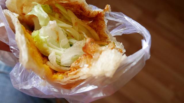 旅店门口的放心健康早餐,蔬菜煎饼,金黄的加上酱料,配上热豆浆。很不错
