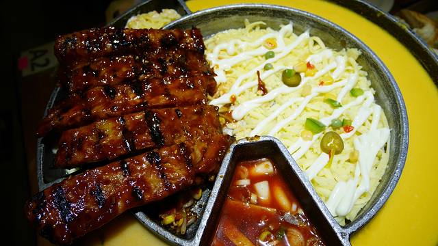 晚餐。韩国料理。团购了个芝士肋排火锅135元,够我一家三口了