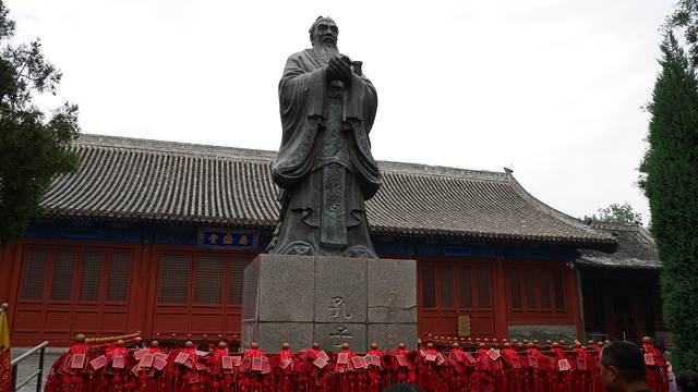 孔庙里是无香火的,大成殿内镶着各朝皇帝对孔子的敬语。