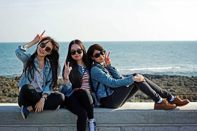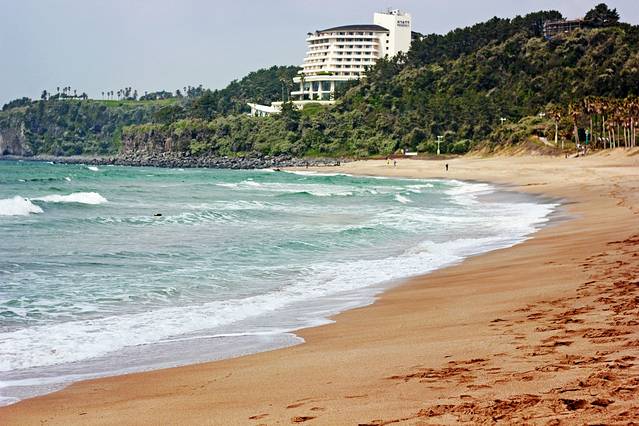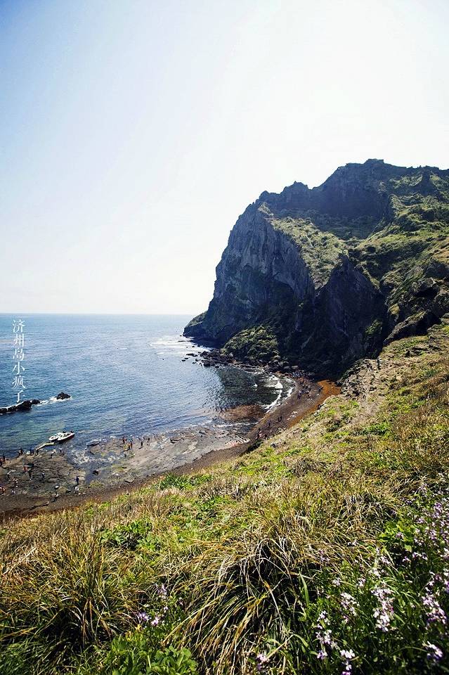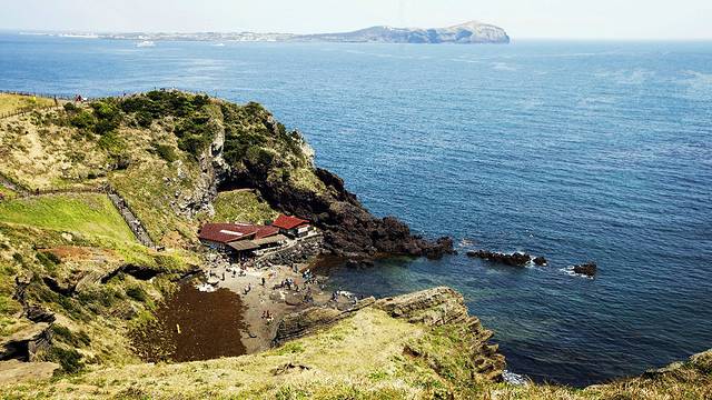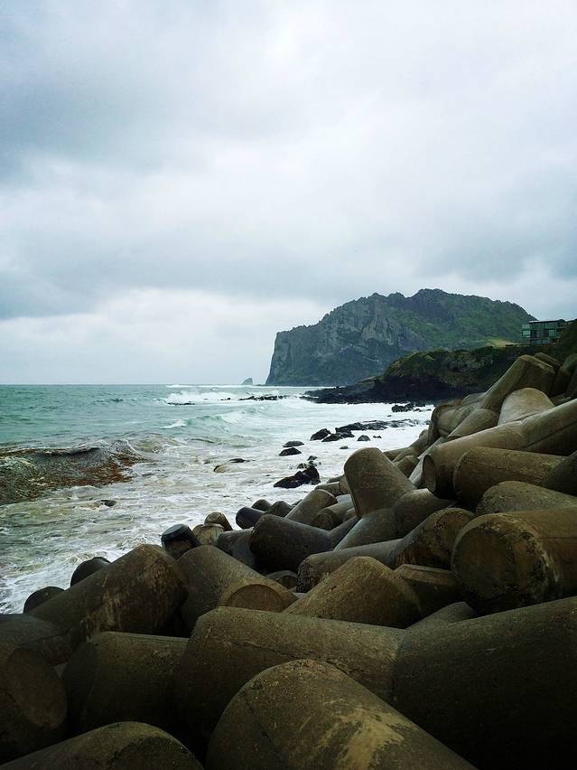 海边,下海作业的海女们刚刚回到岸上,海女在济州岛有着伟大的地位、传奇的故事,当地导游说来到济州岛如果没有近距离的面对面看到海女,便不算来过济州岛。可惜日出峰的游玩时间有限,来不及下到山脚海边去看看海女了。岛上还在工作的海女平均年龄在50岁以上,确实是一件太不可思议的事情,很难想象五六十的妇女还可以在刺骨的海水里憋气几分钟捕捉海产。新时代的女性已经不 愿意再受这样的苦了,所以年轻的海女已经不存在了。济州的海女们现在下海捕鱼已不是为了补贴家用,而更多的是让这个传奇的职业和这种精神让更多的国内外游客所了解。