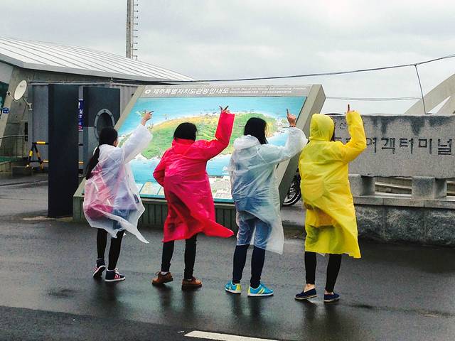刚出门就开始掉雨点绝对不是个好兆头,但我们还是勇敢的启程了!在便利店买了一次性雨衣以后打了车来到西归浦客运站,到目前为止还算是顺利。但我一直绝对纳闷的是旅游业如此发达的济州岛,为何民众普遍的英语水平这么令人堪忧……尤其是开出租车和公交车的大叔们,脾气又烂又不好沟通……