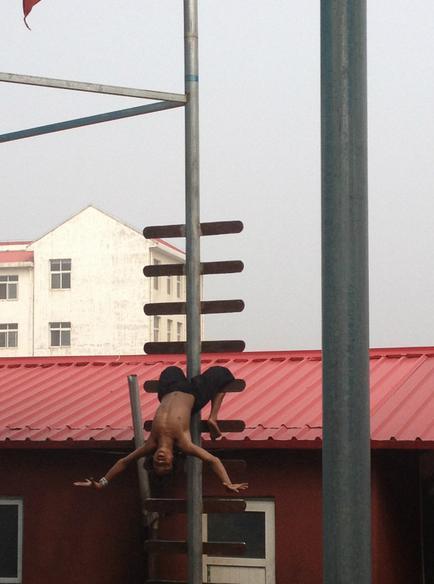 这个小阿哥呢,爬的这个梯子可不是一般的梯子哟,它是刀片组成的梯子,不过他踩在上面表示灰常淡定从容。