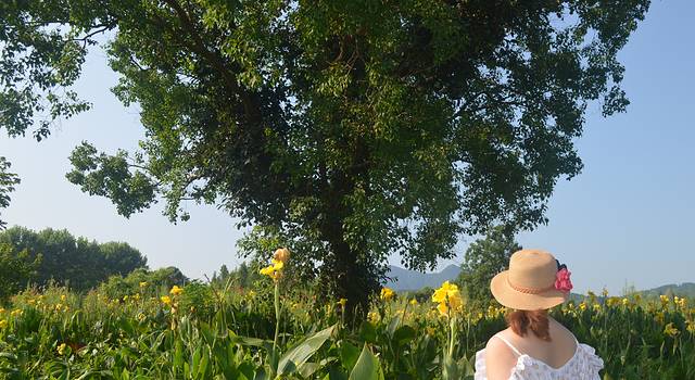 一路骑行。双人的自行车特别适合情侣,一起哼着歌,经过了田野和公路,我们来到了卢村。