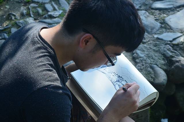 很多学艺术的孩子们都坐在树下面写生,这里真是一个写生的绝佳圣地。亲爱的他随手拿着手中的笔,也开始认真的画起画来。只是随意作画,但看到他认真的样子我已经忍不住不用相机给他来一张了。