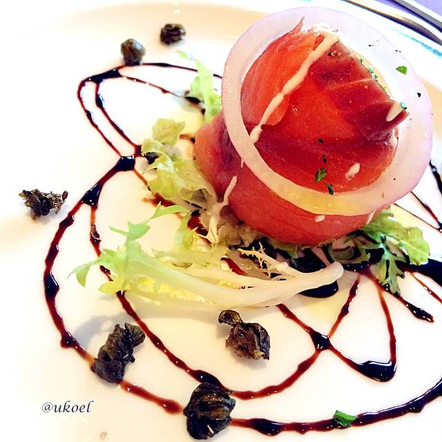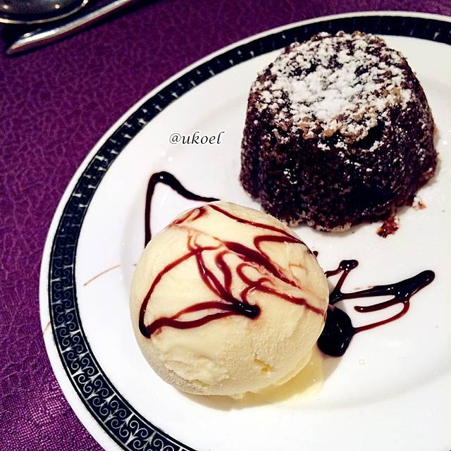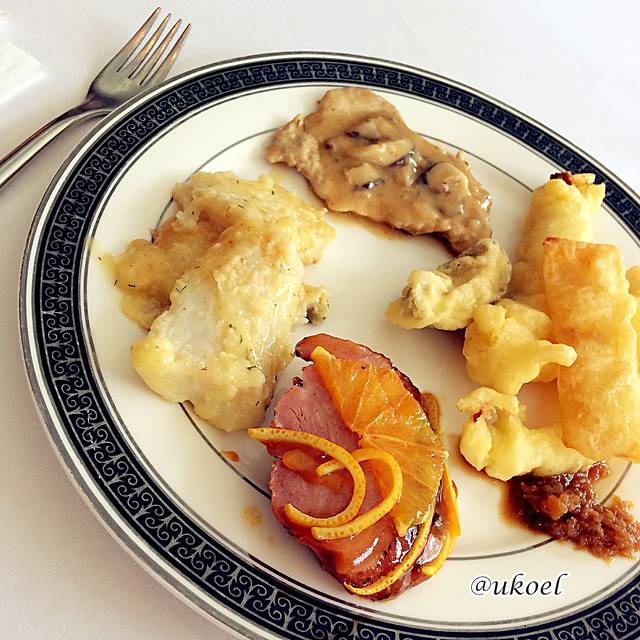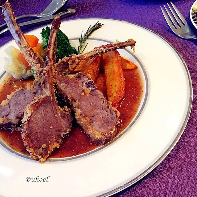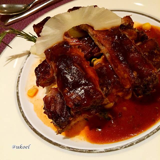 对第一顿晚餐还是有些许期待的。服务生的礼仪很到位,能为每个客人推椅入座和铺餐巾;餐前面包配备3种款式,新鲜现制。前菜选择了烟熏三文鱼,正宗的大西洋三文鱼,而不是廉价的替代品,配上洋葱圈、生菜和油醋汁的点缀,赏心悦目。我果断地加了一盘,同桌的美女妈妈虽然选择的是中餐,但也想要一份尝尝,服务生二话没说就端上来了。第二道奶油菌菇汤,无功无过。主菜要了美式烤肋排配甜玉米,量挺大,就是味道调得太过酸甜,吃得有些腻,建议还是点煎三文鱼吧。甜点是熔岩巧克力蛋糕配香草冰淇淋,在船上能做出这个算是很有心思了,尽管还是略微甜腻,仍然很感激地吃完了。