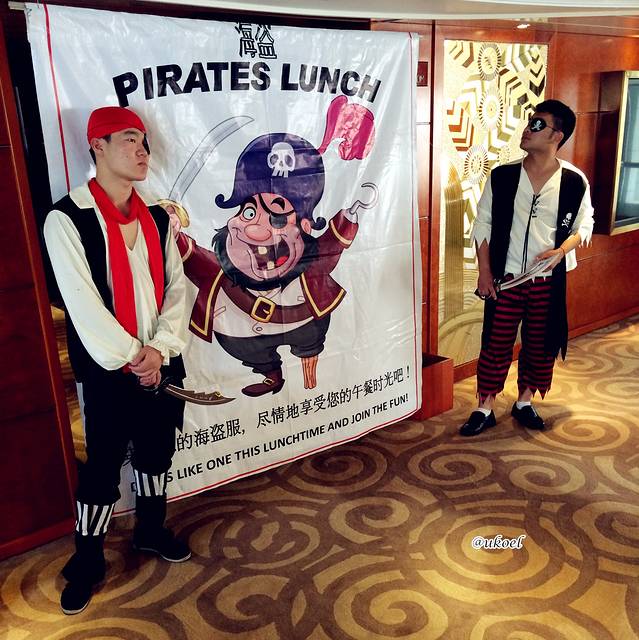 今天的午饭是海盗主题,船方做了一些布置,也有船员穿上海盗服,在大堂和小朋友们嬉闹。不过成年游客基本都没有参与,大部分国人都不习惯这类自娱自乐的方式吧。