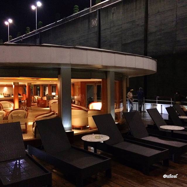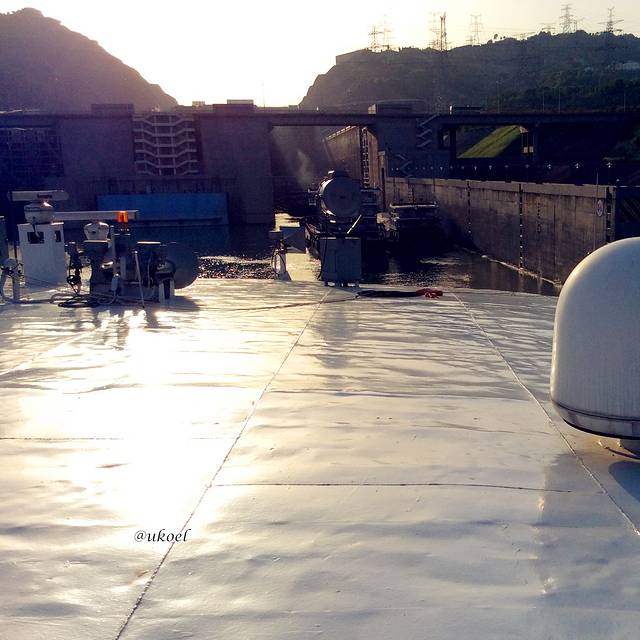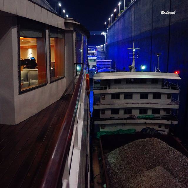 约莫45分钟的表演结束后,大家又纷纷来到甲板上,这会儿已经位于第4级船闸中了。景象和过程与之前无异,只是发现可以穿过6楼另一侧的VIP会议室来到船尾的甲板,看看身后的景色。