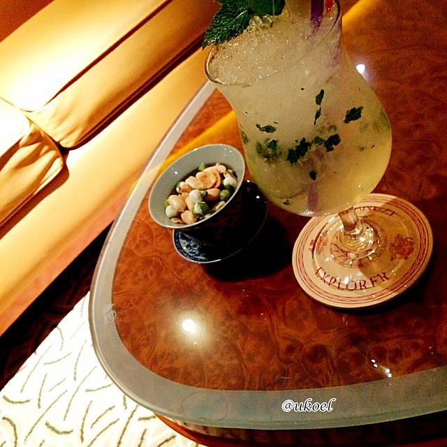 当晚还有一场员工演出,只在快结束时去捧了下场,无所事事间,想着还是去酒吧听听歌,再喝点什么吧。这天的mojito有优惠,50多一杯,还附赠一碟果仁,可惜实在吃不下了。