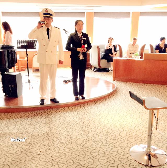 9点左右在3楼唐朝剧院召开游轮说明会,中方和外方主管简单介绍一下各部门负责人,讲解游程和安全规范,并开心地告诉我们本航程只有70多名乘客,而船员就有120人,相比任何一条长江游轮,都可谓皇室般的待遇了。说明会期间看到服务员给个别客人提供了咖啡茶水,估计他们的船票一定很贵吧。